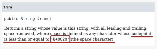 Java 11부터 도입된 'strip()' 메서드 역시 'Character.isWhitespace(int)'에 해당되는 공백을 제거하지만 ZWSP(U+200B) 등, 원하는 공백을 제거하지는 못한다는 것을 확인했습니다.