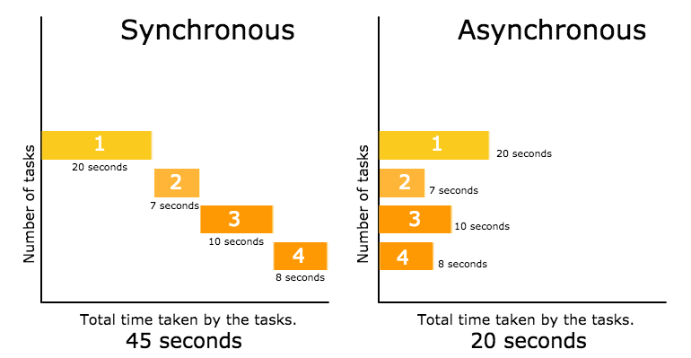 예를 들면 청소하는 사람이 세탁기를 동작시켰습니다. 청소하는 사람은 세탁기의 결과를 신경 쓰지 않아도 되지만 세탁기의 문제로 세탁기의 세탁 작업이 끝날 때까지 다른 일을 할 수 없습니다.