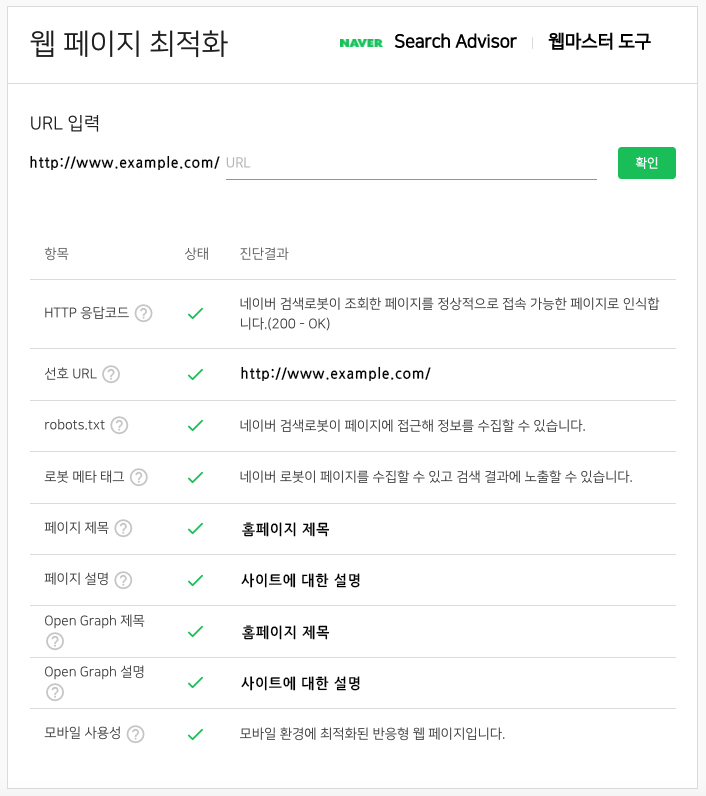최초 사이트 등록에서 사이트의 소유 확인을 위한 HTML 태그를 넣고 소유 인증을 하고 나서 해당 사이트 주소를 입력하면 웹 페이지 최적화 테스트를 할 수 있습니다.