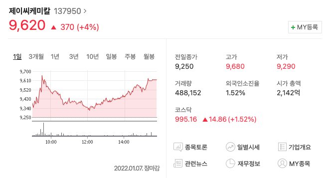 2022년 1월 7일 종가 9,620원 기준의 시가총액은 2142억 원입니다.