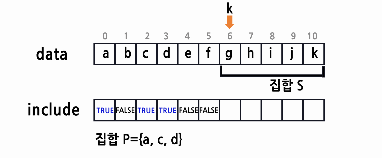 여기서 집합 S는 data[k], ..., data[n-1] 즉, k 번째부터 마지막 원소까지 연속된 원소들이고, 집합 P는 include[i]=true, i=0, ..., k-1 인 원소들 즉, 처음부터 k-1까지의 원소들 중 일부가 됩니다.