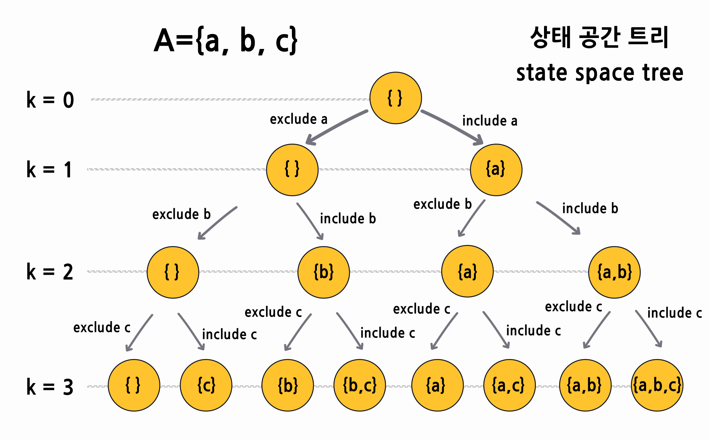 (시각화된 상태 공간 트리를 통해 재귀 함수로 멱집합을 구하는 원리를 좀 더 쉽게 이해할 수 있습니다.)