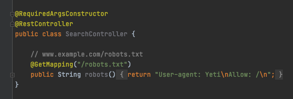 springboot로 서비스를 만들고 있어서 robots.txt 부분은 RestController를 사용하여 처리하였습니다.