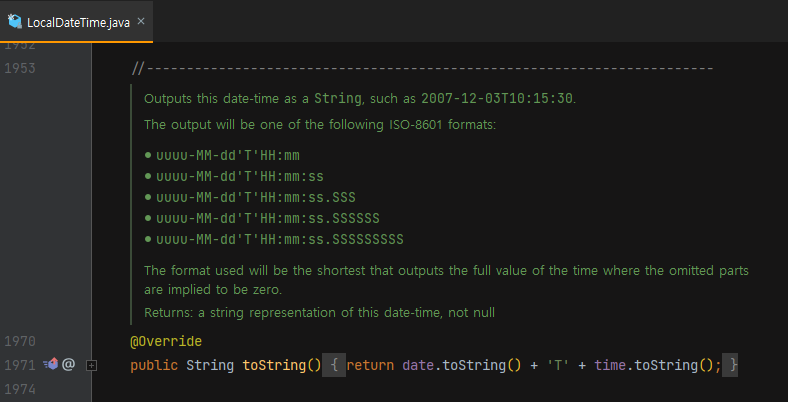 원인을 찾기 위해서 LocalDateTime 클래스의 toString() 메서드를 확인해봤습니다.