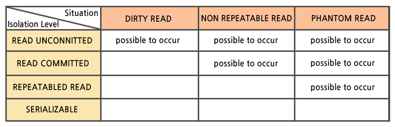 격리 레벨(Isolation Level)은 4단계로 되어있으며 아래와 같습니다.