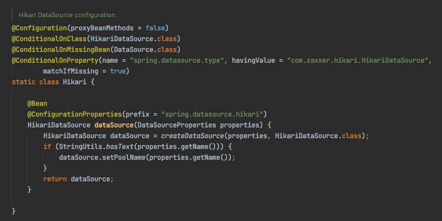 Spring Boot의 AutoConfiture를 통해 xml 또는 properties, yml 파일의 spring.datasource.* 에 대한 설정이 DataSourceProperties에 전달되며, 이는 DataSource의 디폴트 구현체 클래스에 자동으로 설정됩니다.