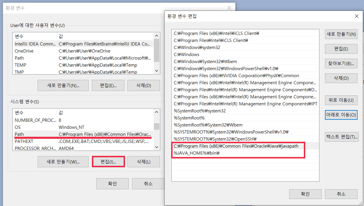 중간 과정으로 jdk가 설치된 폴더 경로를 'JAVA_HOME'으로 등록하고, 최종적으로 'JAVA_HOME₩bin'을 Path에 등록한 것인데요.