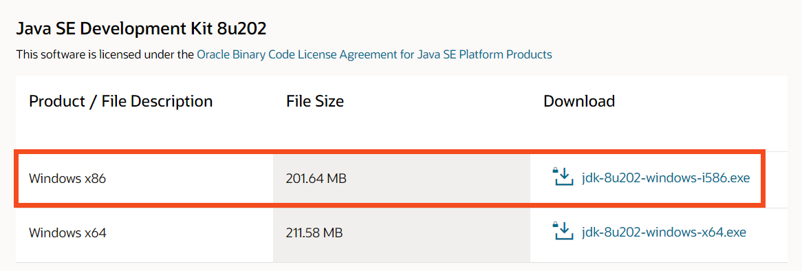 32비트의 Java8을 설치하기 위해서는 아래 Oracel 사이트를 통해 Java SE Development Kit 8u202, Windows x86 버전을 다운로드합니다.