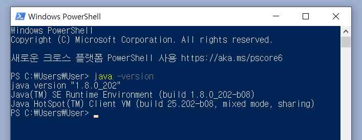 설치 및 환경 변수 설정이 완료되었다면 Windows PowerShell을 실행하여 'java -version' 명령어를 통해 java가 제대로 설치되어 있는지 확인할 수 있습니다.