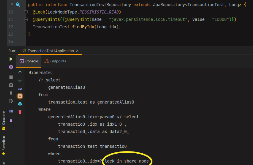 (LockModeType.PESSIMISTIC_READ를 사용했을 때 쿼리문에서 lock in share mode가 붙어서 실행되는 것을 확인할 수 있습니다.)