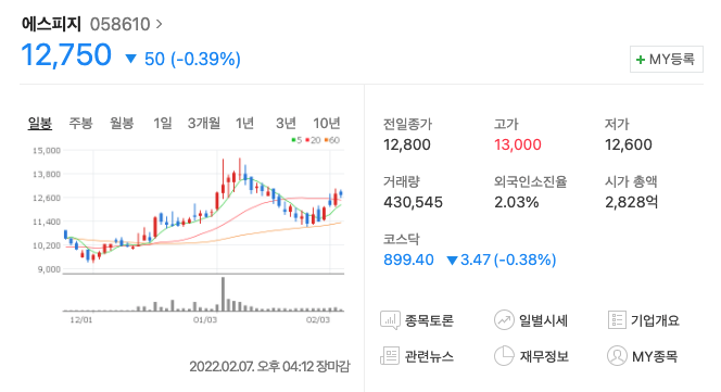 (2022.02.07 종가 기준 12,750원으로 시가총액 2828억 원 / 총 상장 주식 수 22,177,360주)