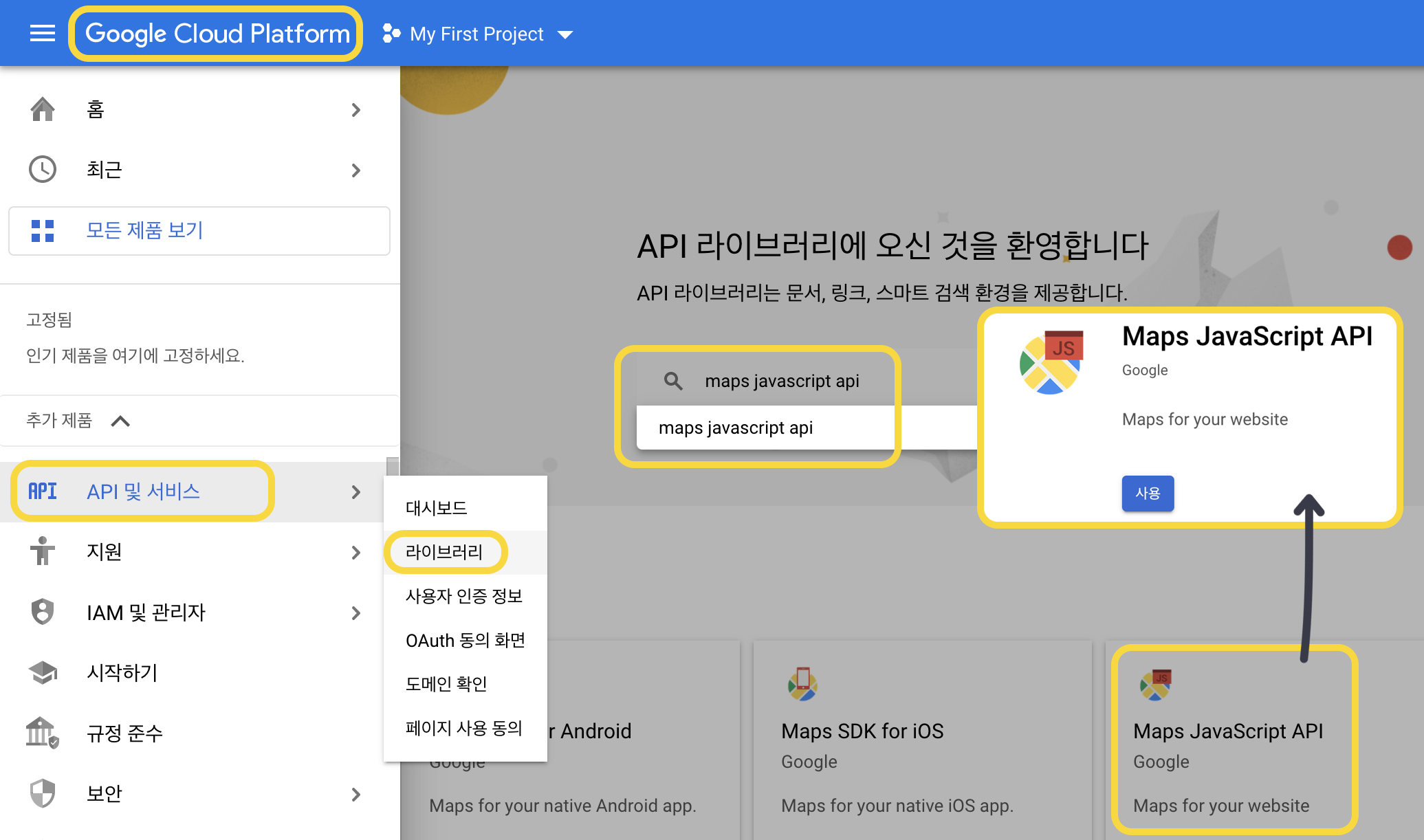 Google Cloud Platform -> API 및 서비스 -> 라이브러리 -> Maps JavaScript API