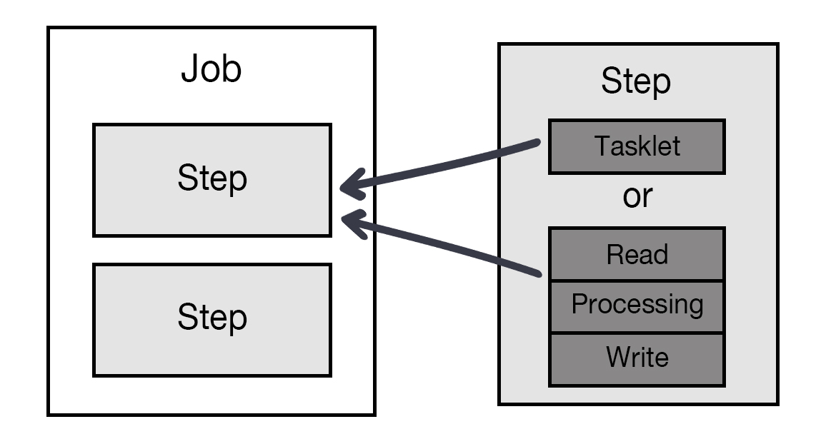 Spring Batch는 최소 1개 이상의 Job을 생성할 수 있고, 각각의 Job 안에는 여러 Step이 존재할 수 있으며, 각각의 Step은 Tasklet 혹은 Read, Processing, Write 묶음 과정이 존재할 수 있습니다.