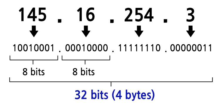 IPv4(IP version 4)는 전 세계적으로 사용된 첫 번째 인터넷 프로토콜이며, 주소는 8 bits씩 4자리로 총 32 bits(4 bytes)입니다.