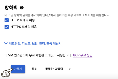 이어서 방화벽 설정에서 HTTP 트래픽 허용, HTTPS 트래픽 허용 여부를 설정하고 인스턴스를 생성합니다.
