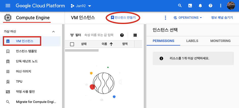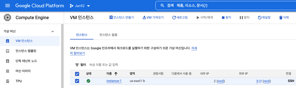 VM 인스턴스에서 상단 중간에 있는 '인스턴스 만들기'를 클릭하여 인스턴스 생성을 시작합니다.