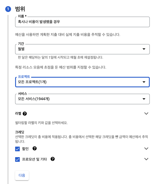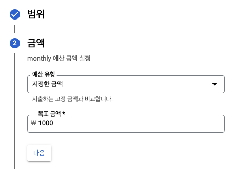 위에서 생성한 인스턴스만 프로젝트로 설정해도 되지만 일단은 전체 프로젝트를 범위로 잡고 예산을 생성하였습니다.