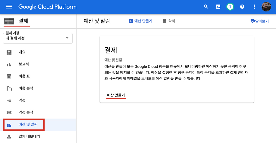 혹시 모를 과금에 대비해 알림 설정을 하기 위해서는 구글 클라우드 플랫폼에서 결제 -> 예산 및 알림으로 들어갑니다.