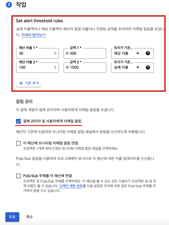 마지막 작업 부분에서는 위에서 설정한 범위와 금액에 따라 이메일을 발송할 기준을 설정할 수 있습니다.