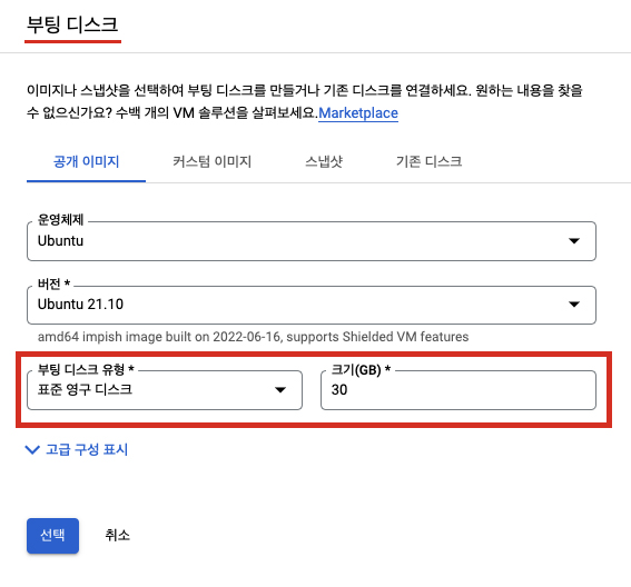 부팅 디스크의 경우 주의해야 할 점은 부팅 디스크 유형의 default 값이 '균형 있는 영구 디스크'로 설정되어 있다는 점입니다.