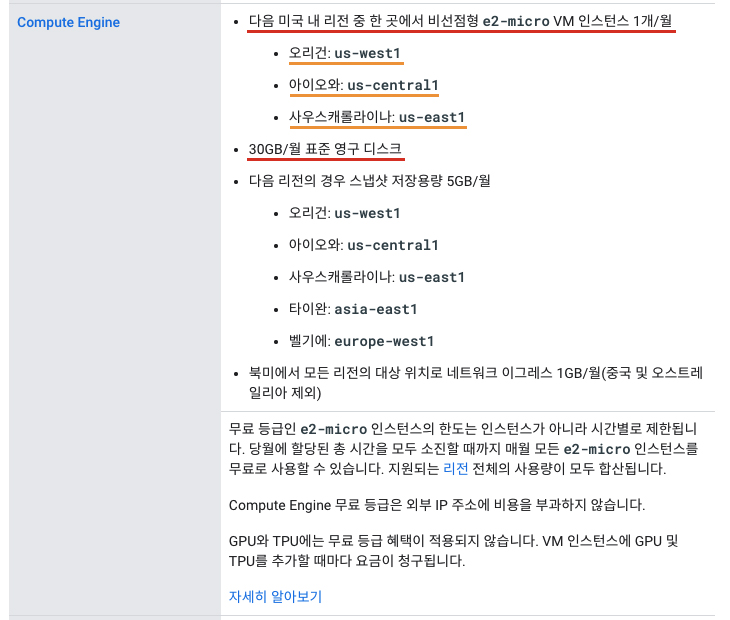 위 무료 사항에서 주목해야 할 부분은 리전, 인스턴스 머신, 디스크 및 용량인데요.