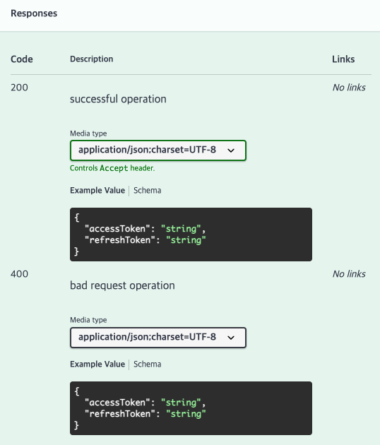 responseCode 속성으로 http 상태 코드를 설정할 수 있고, description으로 response에 대한 설명을 추가할 수 있습니다. @ApiResponse 설정을 통해 응답 결과로 나올 수 있는 response 구조를 미리 확인할 수 있게 됩니다.