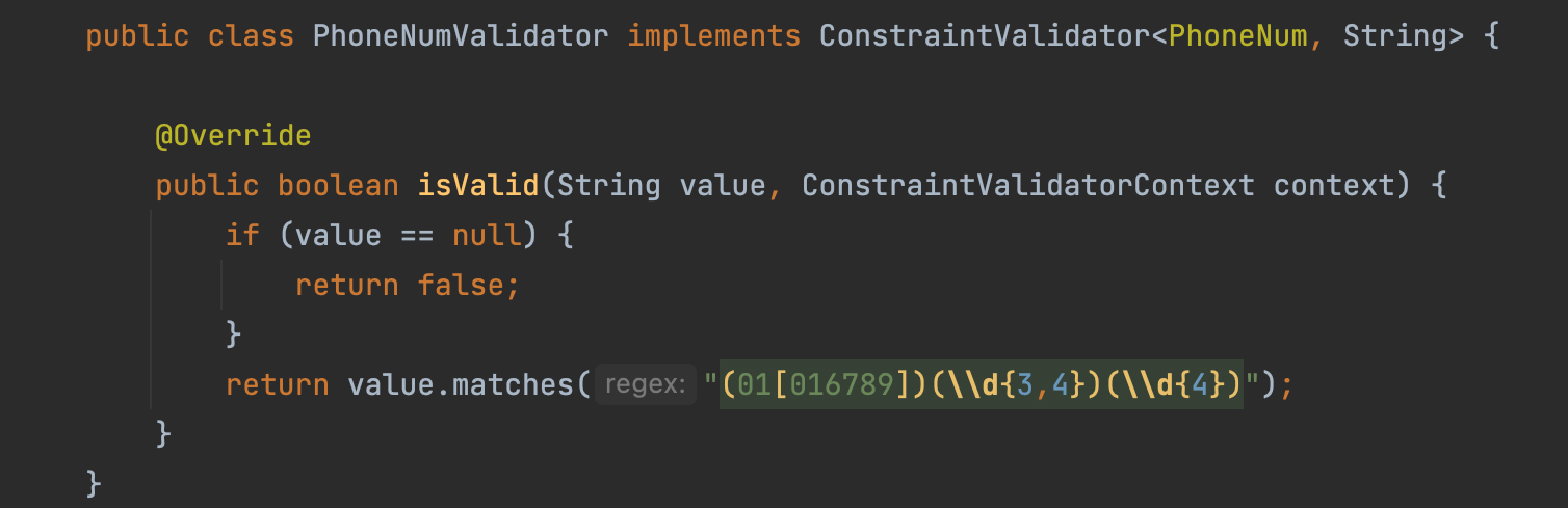 예시로 휴대폰 번호 형식에 대한 유효성 검사를 적용해 볼 텐데요. 이런 간단한 패턴 같은 경우는 실제로 @Pattern 어노테이션을 사용해서 처리하면 되지만 구현에 대한 예시라는 점 참고 부탁드리겠습니다.
