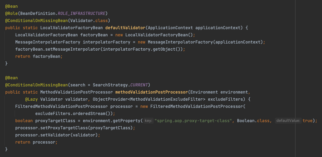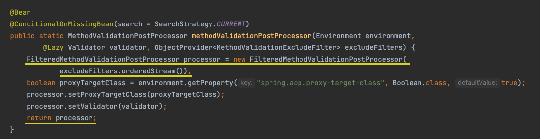 다시 ValidationAutoConfiguration 클래스로 돌아와서 methodValidationPostProcessor() 메서드를 살펴보겠습니다.