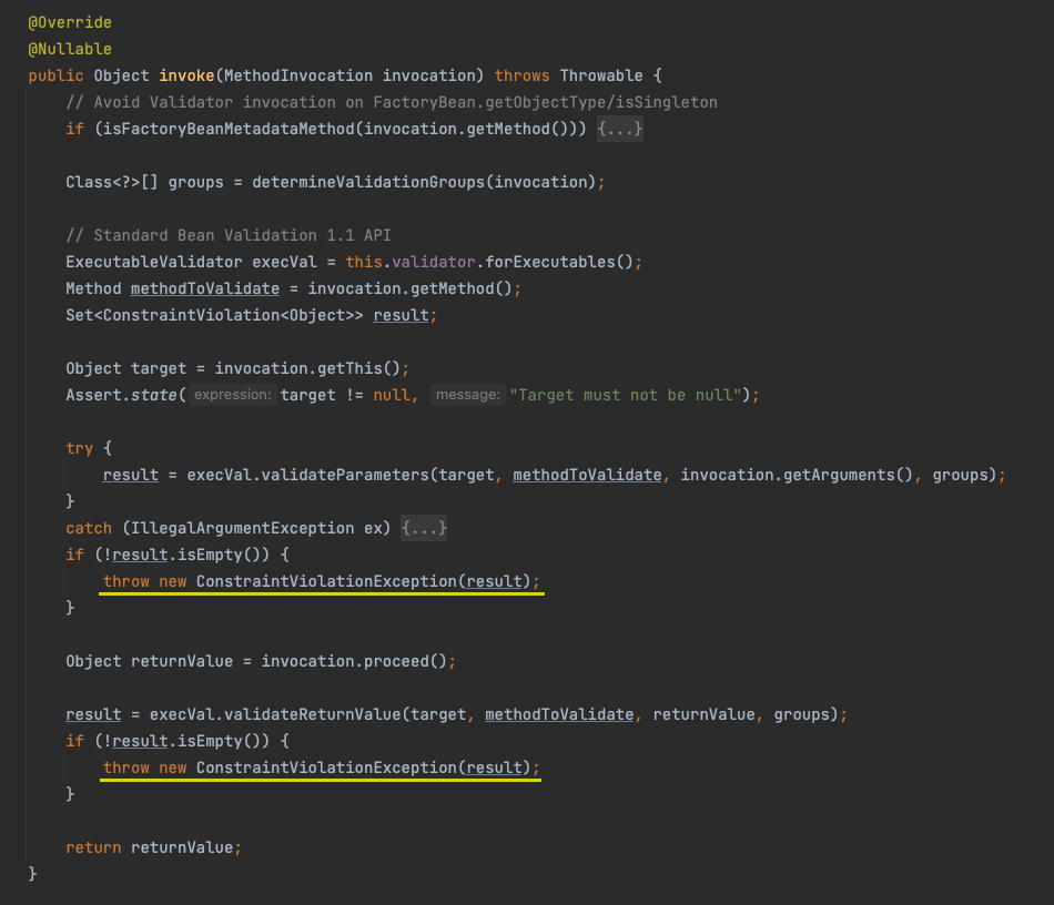 해당 메서드에서 유효성 검증이 진행되며, 이때 유효성 검사에 문제가 있을 경우 ConstraintViolationException 예외를 발생시키는데요. Controller 단에서 발생되는 MethodArgumentNotValidException 예외와 다르다는 것을 알아두어야 나중에 Exception 처리할 때 도움이 됩니다.