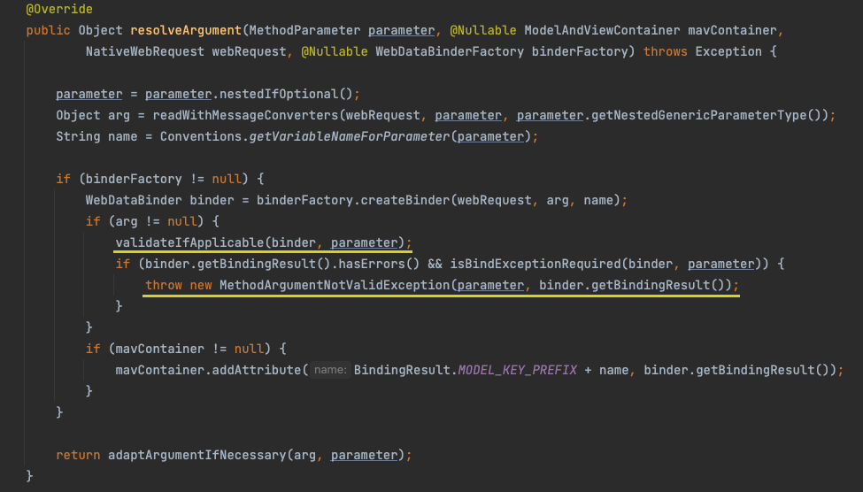 그중에서도 해당 클래스의 resolveArgument() 메서드 내부에서 유효성 검증이 진행되며, 문제가 있을 경우 MethodArgumentNotValidException 예외를 발생시키게 됩니다.