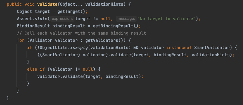 다시 validateIfApplicable() 메서드로 돌아와 내부적으로 최종 검증을 하는 validate() 메서드 부분입니다.