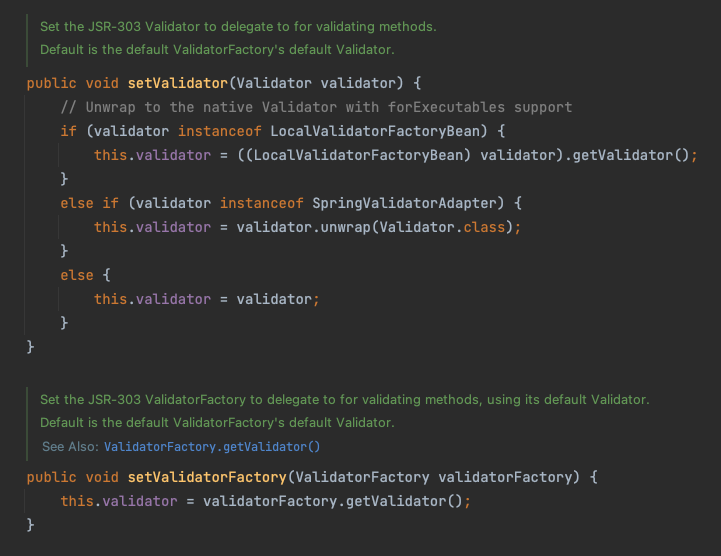 FilteredMethodValidationPostProcessor 클래스는 MethodValidationPostProcessor를 상속한 클래스인데, 해당 클래스의 setValidatorFactory() 메서드를 보면 default ValidatorFactory의 dafault Validator를 사용한다는 것을 볼 수 있습니다.