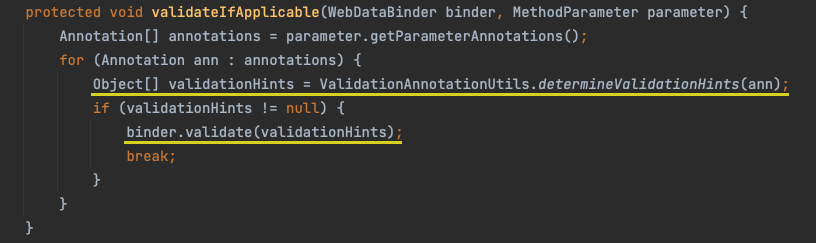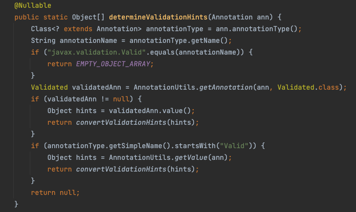 유효성 검증이 일어나는 부분을 찾기 위해 validateIfApplicable() 메서드를 살펴보면, 유효성 검증을 위한 도구를 찾아오기 위해 추상 클래스인 ValidationAnnotationUtils의 determineValidationHints() 메서드가 실행되는데요.