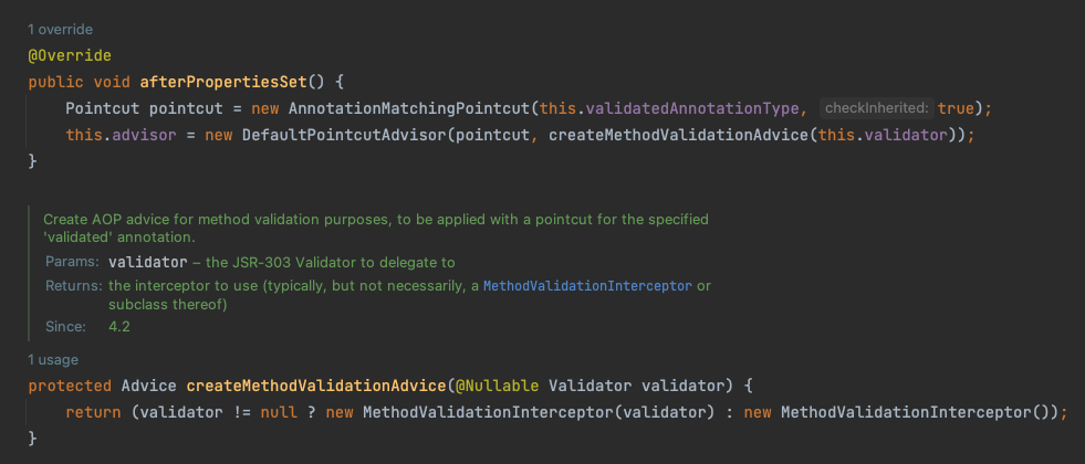 두 메서드 역시 MethodValidationPostProcessor 클래스의 메서드로 여기서 핵심은 createMethodValidationAdvice() 메서드를 통해 AOP Advice인 MethodValidationInterceptor를 등록한다는 것입니다.