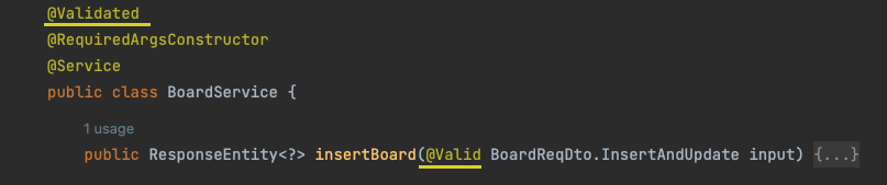 앞에서 이야기한 것처럼 일반적으로 요청 객체에 대한 유효성 검증은 컨트롤러에서 최대한 처리하게 됩니다. 하지만 불가피하게 Service 단 같은 다른 곳에서 검증을 진행해야 하는 경우가 있을 수 있는데요.
