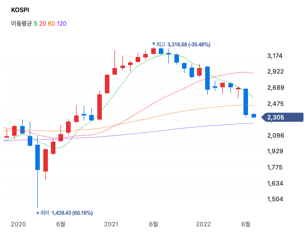 2022년 7월, 현재 국내 시장은 양적완화 정책의 여파와 러시아 · 우크라이나 전쟁의 여파로 인한 인플레이션에 직격타를 맞아 2021년 6월, 코스피 3300p 고점을 찍은 후, 1년간의 하락 추세에 있는데요.