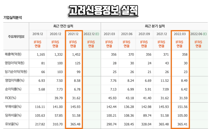 2021년 고려신용정보의 연간 실적은 1,452억 원의 매출액과 125억 원의 영업이익으로 전년 대비 각각 9%, 25% 증가했는데요.