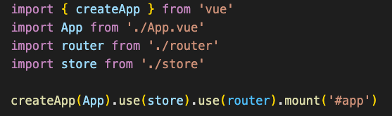내용을 살펴보면 vue로부터 createApp을 가져옵니다. 그리고 createApp 함수를 통해 App.vue 컴포넌트를 가지고 인스턴스를 만들어서 #app(id="app")에다가 해당 인스턴스를 mount 한다는 것인데요.