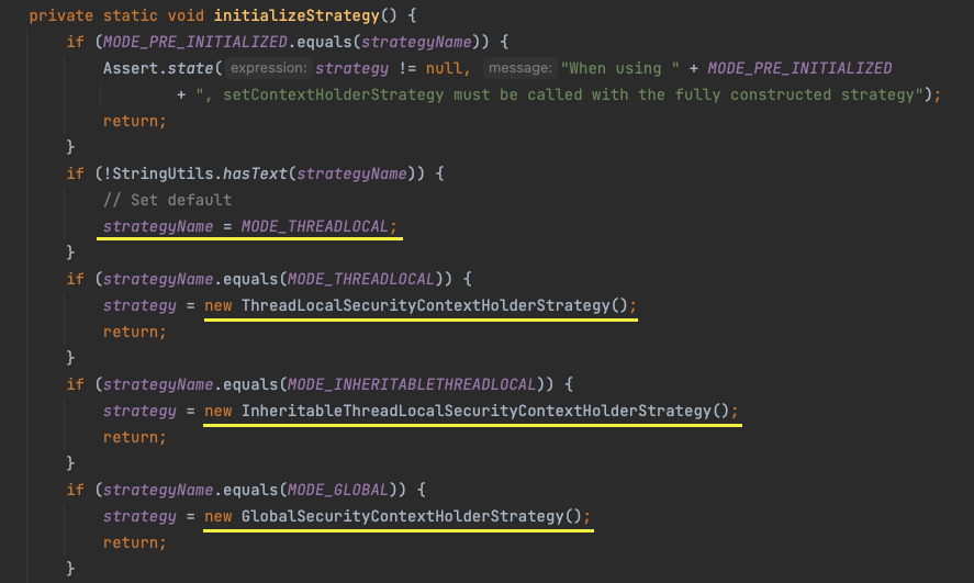 SecurityContextHolder 클래스의 initializeStrategy() method입니다.