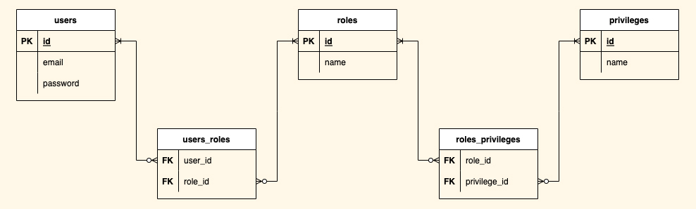 Entity는 다음과 같이 User, Role, Privilege(사용자, 역할, 권한) 세 개의 클래스를 사용하였고, 이들은 서로 간에 다대다(Many To Many)의 관계로 이루어져 있습니다.