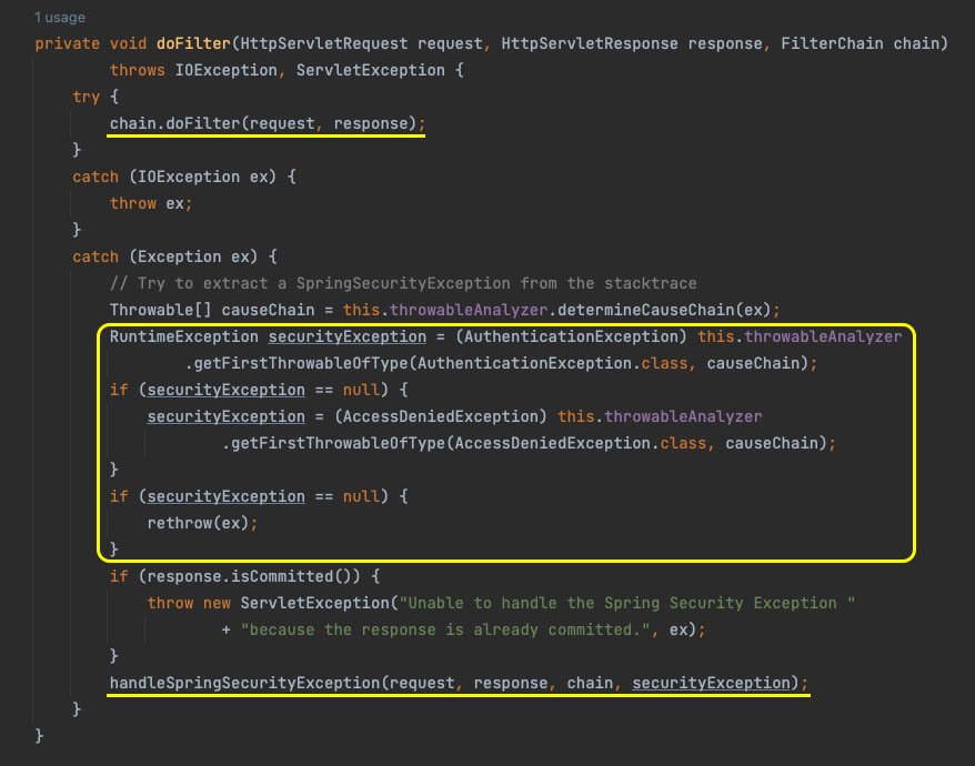 ExceptionTranslationFilter의 doFilter() 메서드를 살펴보면 try 부분에서 chain.doFilter() 메서드를 통해 다음 동작하는 Filter를 동작시키고, 여기서 발생하는 Exception(AuthenticationException || AccessDeniedException)을 잡아서 handleSpringSecurityException() 메서드를 통해 처리하게 되는데요.