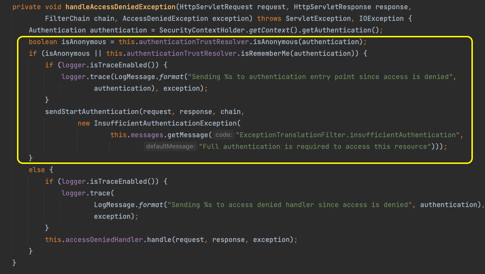 이어지는 과정은 handleSpringSecurityException() 메서드를 거처 handleAccessDeniedException() 메서드가 동작하게 되는데요.