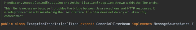먼저 ExceptionTranslationFilter의 경우 스프링 시큐리티의 filter chain에서 인증과 인가에 대한 Exception을 터트리는 역할을 하는데요. (AccessDeniedException and AuthenticationException)