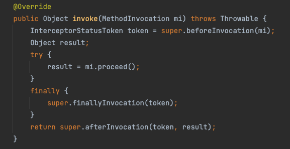 실제 동작 부분 역시 super.beforeInvocation(), super.finallyInvocation(), super.afterInvocation()처럼 상위에 있는 AbstractSecurityInterceptor의 메서드를 사용하여 동작하는 것을 볼 수 있습니다.