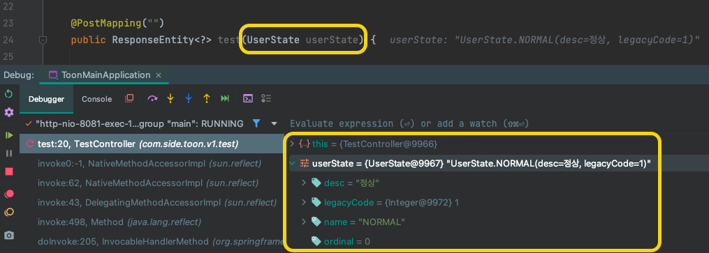 이때 attemptToConvertStringToEnum 클래스에서 해당 과정이 처리되며 Enum이 정상적으로 매핑되게 되는 것입니다.