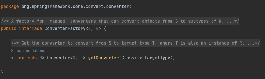 변환하기 전 String 타입을 EnumMapperType 인터페이스를 상속받은 Enum 타입으로 변환하기 위한 ConverterFactory이며, 코드를 따라가 보면 내부적으로 Converter interface를 구현하여 convert() 메서드를 통해 변환 작업이 이뤄지는데요.