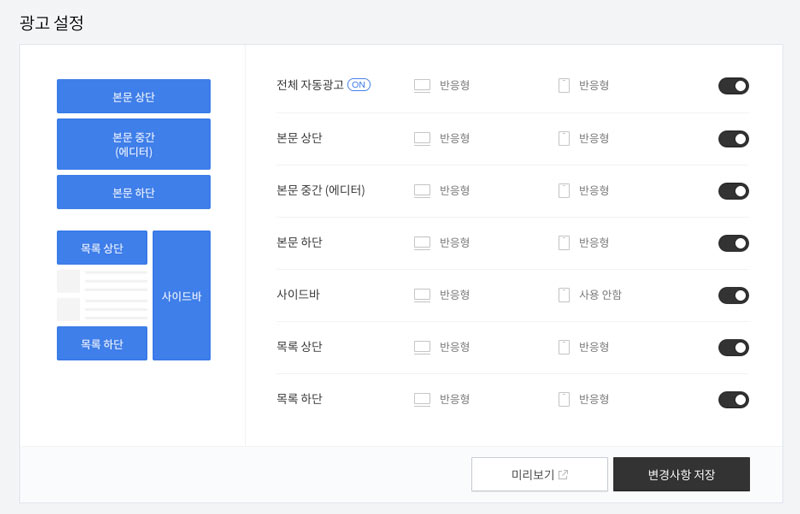 이 부분은 해결 방법을 찾아보기 전에는 신경 쓰지 못했던 부분인데요. 기존에 티스토리 자체적인 광고 설정에서 애드센스의 전체 자동 광고가 실행되고 있었으며, 애드센스 자체적으로도 자동 광고 설정이 적용되고 있었습니다.