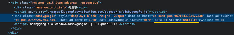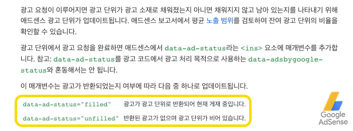 이 매개변수가 광고가 반환되어 게재 중일 경우 data-ad-status="filled" 상태가 되며, 반환된 광고가 없으며 해당 영역이 빈 경우 data-ad-status="unfilled" 상태로 반환된다고 합니다.