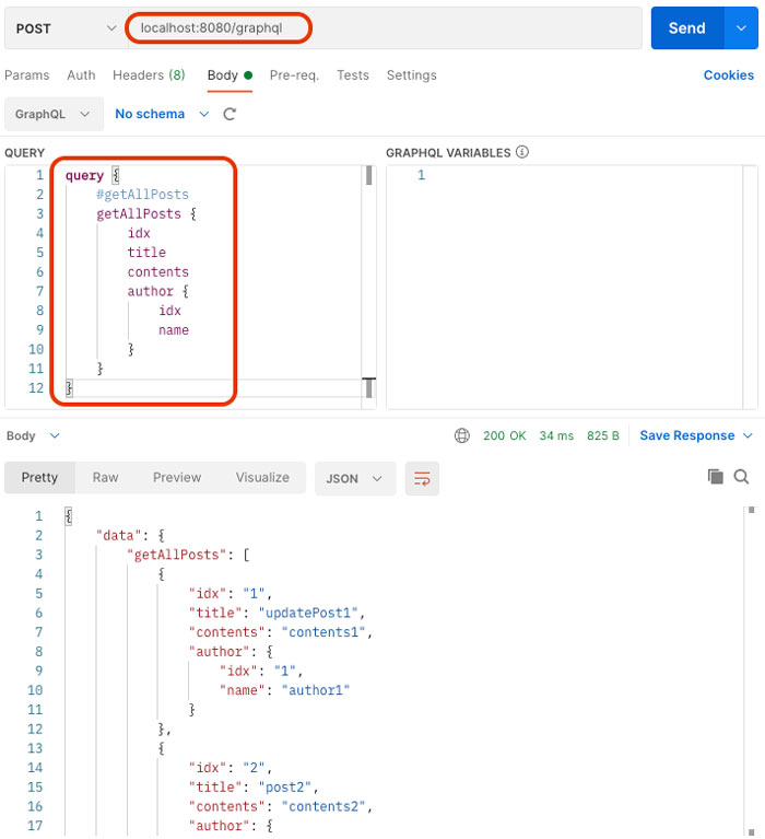 요청 결과 Post 객체의 idx, title, contents와 author의 idx, name을 반환하는 것을 확인할 수 있습니다.