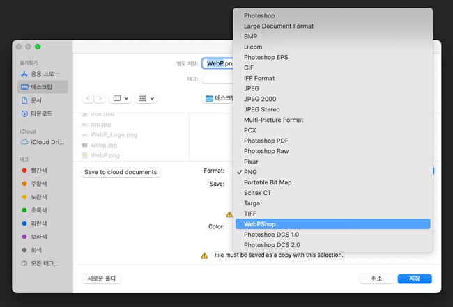 위와 같이 포토샵에서 WebP 파일을 여는 것이 안되거나, 해당 확장자로 저장하는 것이 안 되는 경우가 있는데요.